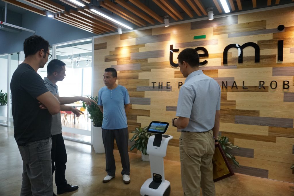 tēmi机器人全球CEO – Gal Goren与大中华区总监任正军热情接待了陈会长一行人,带领陈会长参观了tēmi办公室,详细介绍了tēmi的发展历程,并现场进行机器人演示。tēmi机器人可以做许多养老院护工所做的工作,它可以提醒老人们按时吃药,可以陪老人们聊天,给老人们播放歌曲、唱戏,还可以帮助老人通过屏幕和老人的家属进行视频聊天等等。